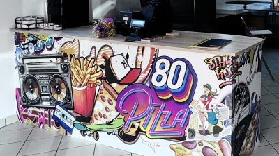 Decorazione bancone di una pizzeria mediante tecnica Tattoowall®.