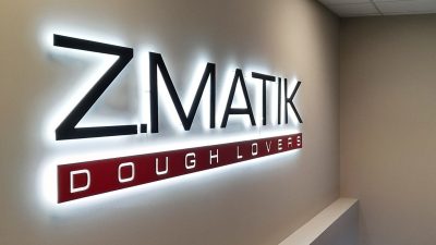 Insegna receptionFornitura e montaggio di insegna luminosa a luce riflessa con lettere in Dibond sagomato.
